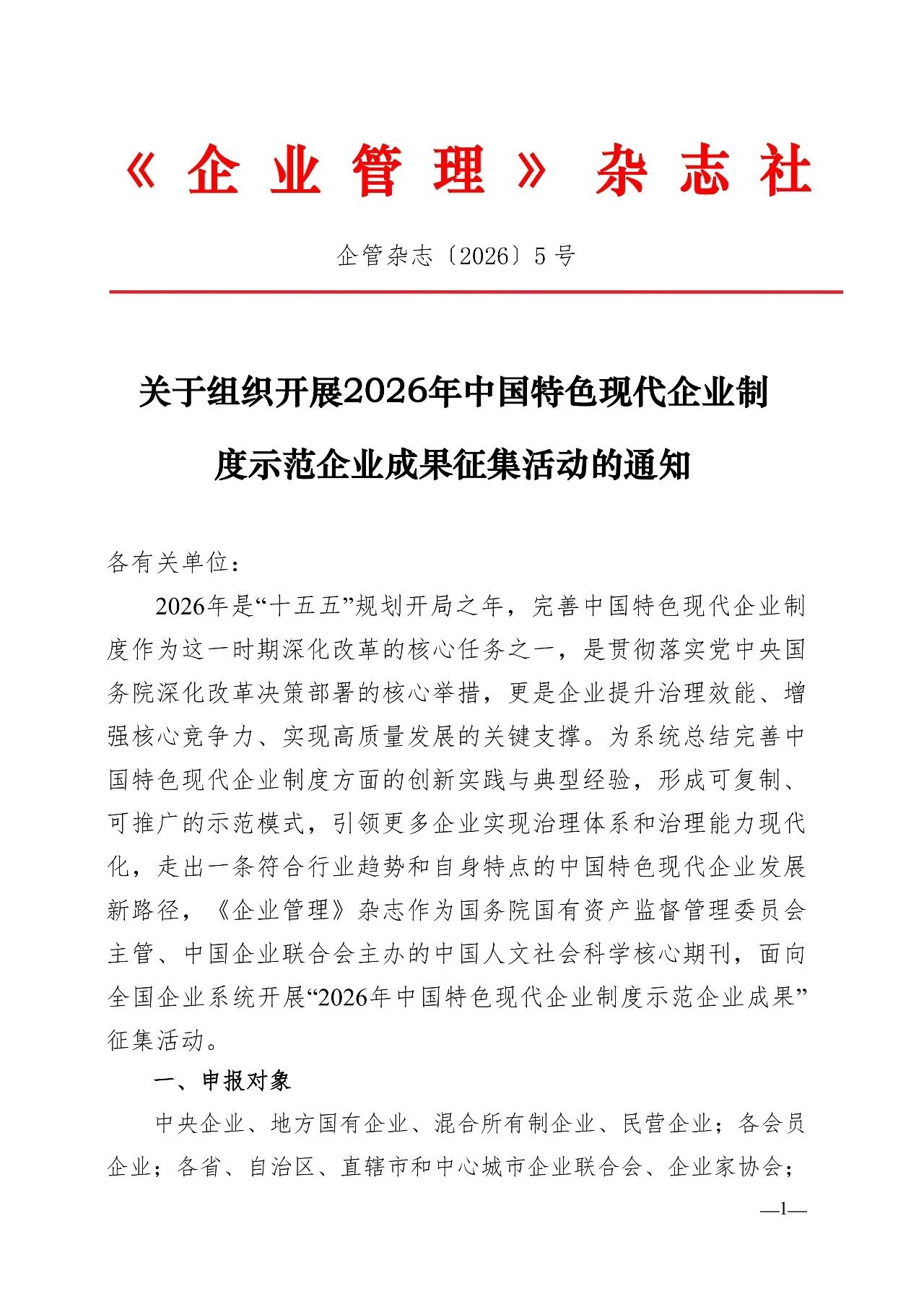 关于组织开展2026年中国特色现代企业制度示范企业成果征集活动的 通知
